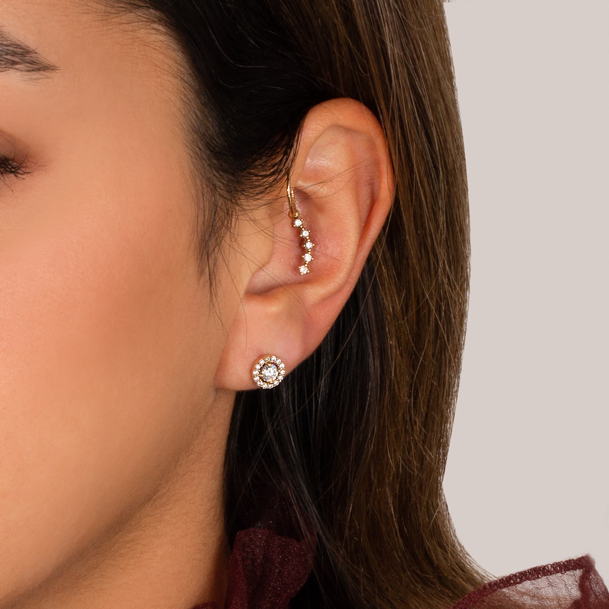 ارتقِ بأسلوبك مع أقراط كلارا المصنوعة من الذهب الصلب عيار 18 قيراطًا والمزينة بألماسات مستديرة لامعة. مستوحاة من التيجان الملكية، تتميز هذه الأقراط بتصميم دائري جذاب ينضح بالرقي. اترك انطباعًا أنيقًا بهذه الأقراط الفاخرة والحصرية.