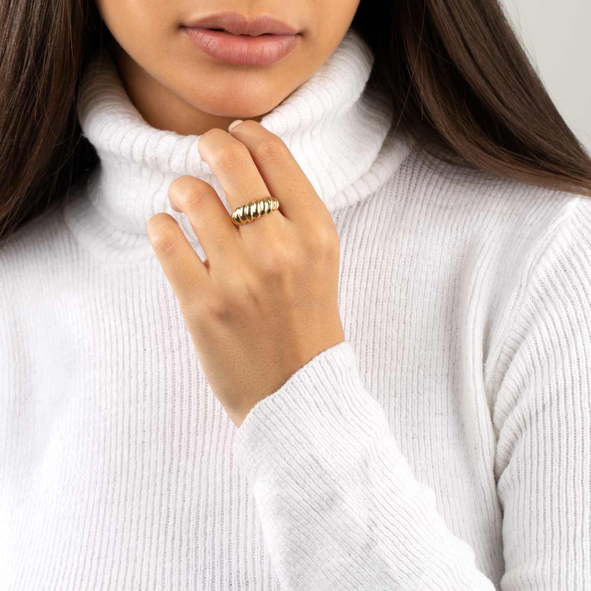 استمتعي بالفخامة مع خاتم الكرواسون المصنوع من الذهب عيار 18 قيراطًا. عززي أناقتك بهذه القطعة الأنيقة والحصرية، المستوحاة من الحلوى الفرنسية الفاخرة. مثالية لأولئك الذين يقدرون الأشياء الفاخرة في الحياة، ويرغبون في إضافة لمسة من الرقي إلى خزانة ملابسهم.