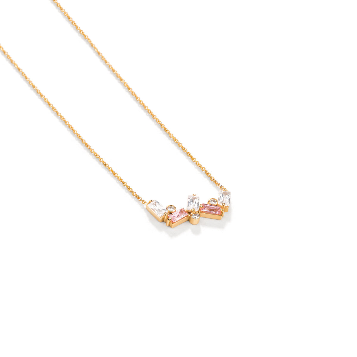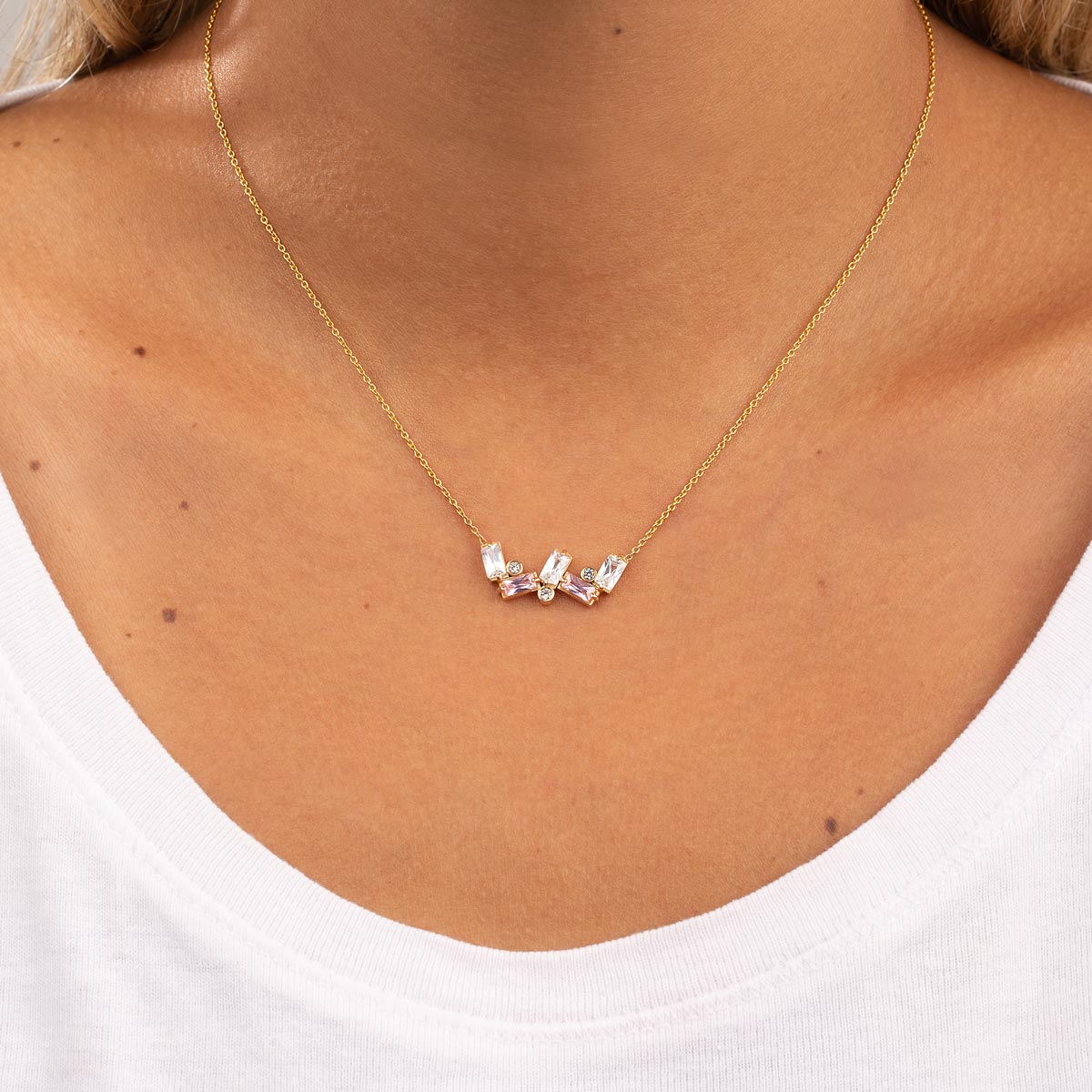 استمتعي بالفخامة مع قلادة الأحجار الملونة المكسورة المصنوعة من الذهب الصلب عيار 18 قيراطًا والمزينة بأحجار وردية وبيضاء لامعة مذهلة. مثالية لإضافة لمسة من الأناقة والرقي إلى أي زي، هذه القلادة تحفة فنية حقيقية. ارتقِ بأسلوبك مع هذه القطعة الحصرية.