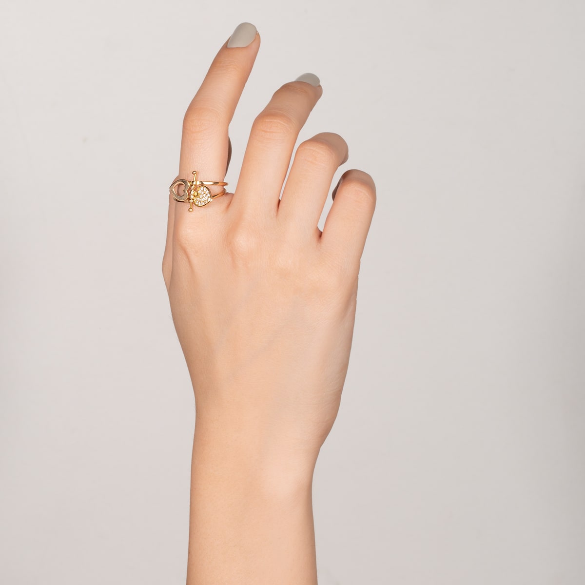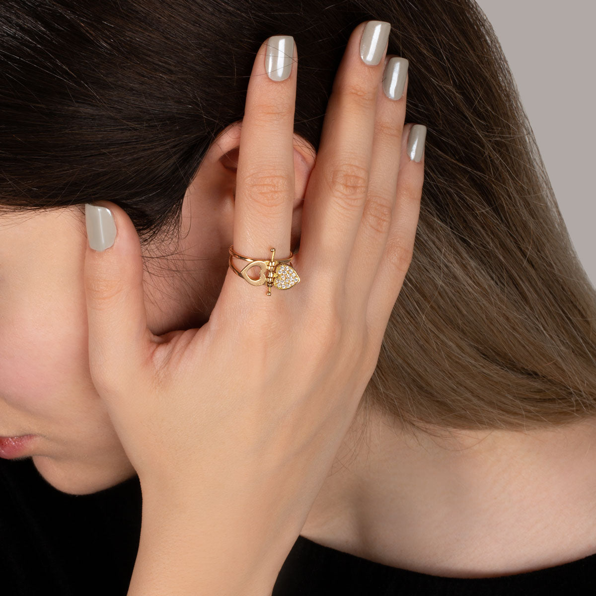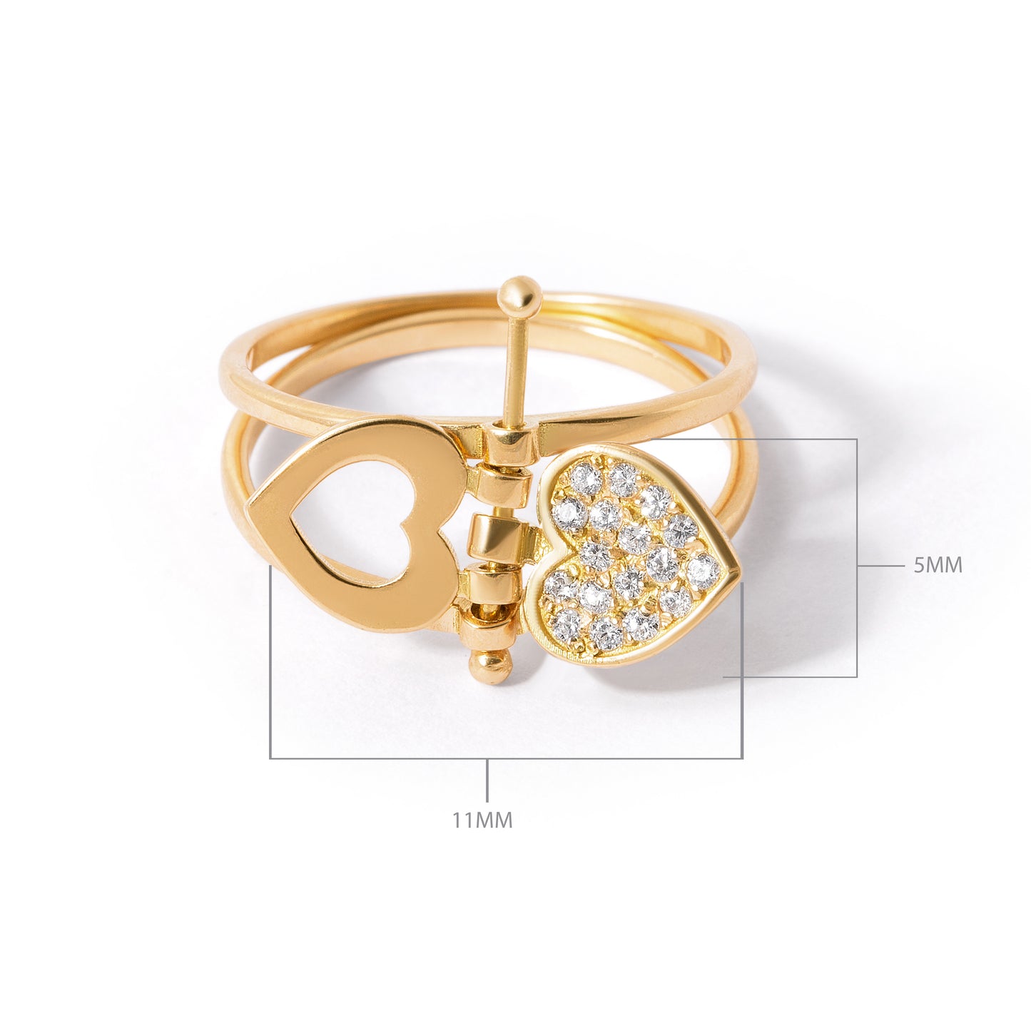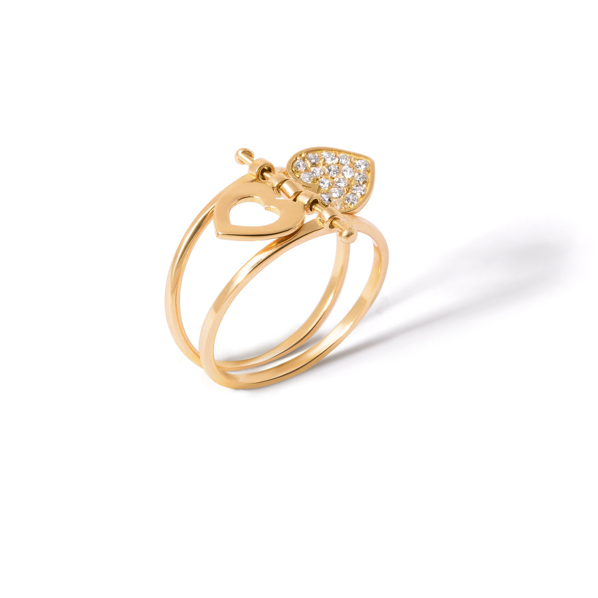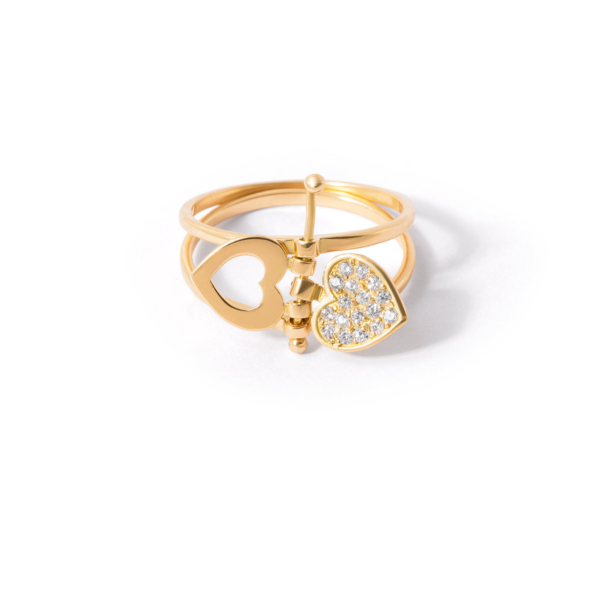 استمتعي برمز الحب والفخامة المطلق مع خاتمنا الماسي على شكل قلبين. مصنوع من الذهب عيار 18 قيراطًا، يتميز هذا الخاتم المذهل بقلبين متشابكين مزينين بألماس مبهر. أضيفي لمسة من الأناقة والرقي إلى أي زي مع هذه القطعة الرائعة.