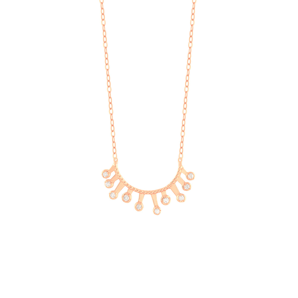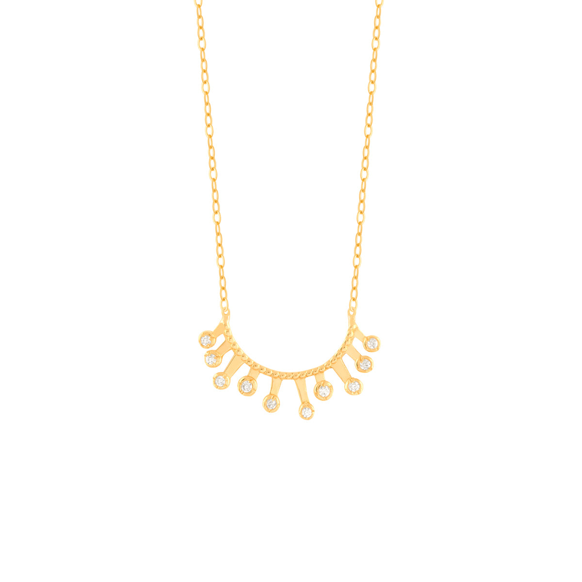 استمتعي بفخامة عقد سلسلة القطرات الخاص بنا. مصنوع يدويًا من ذهب عيار 18 قيراطًا ومزين بالألماس الرقيق، هذا العقد ينضح بالرقي والحصرية. ارتقِ بأي زي بأناقة لا تنتهي مع عقد سلسلة القطرات الخاص بنا.