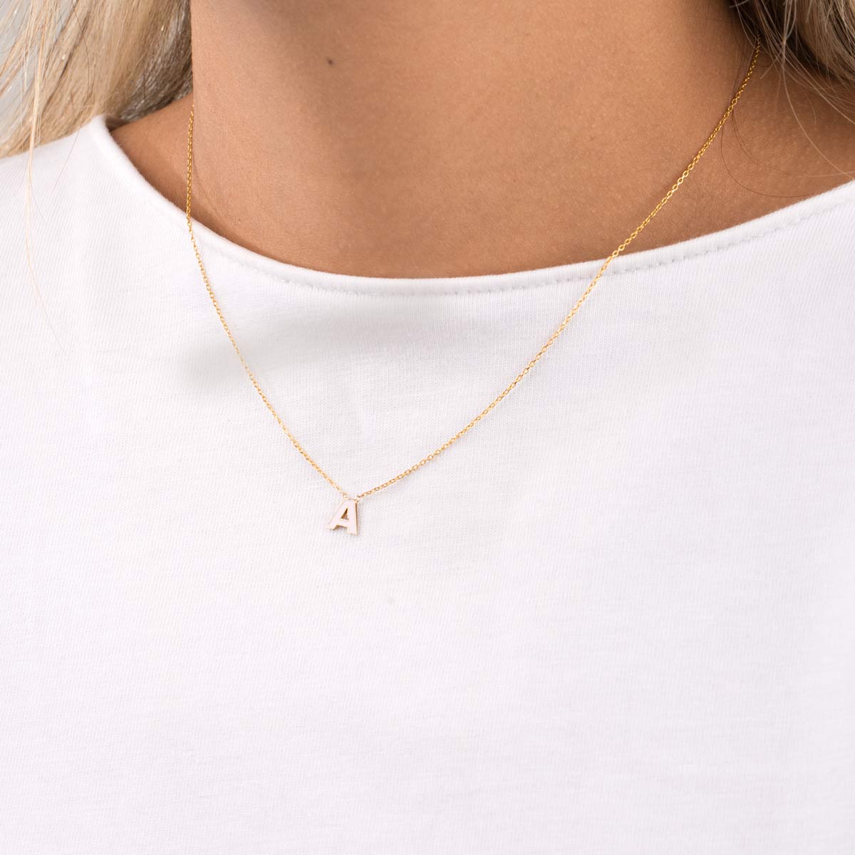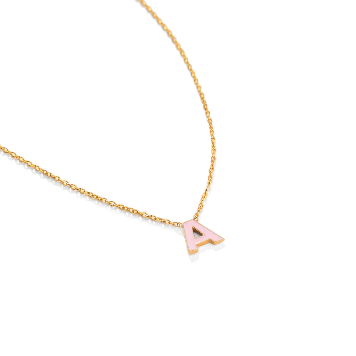 تتميز هذه القلادة الأنيقة بسلسلة من الذهب الصلب عيار 18 قيراطًا باللون الوردي وقلادة حرف A مطلية بالمينا البيضاء. الإكسسوار المثالي لإضافة لمسة من الأناقة والحصرية إلى أي زي. يمكن أن تمثل قلادة الحرف A متعددة الاستخدامات اسمك الأول أو اسمًا مهمًا، مما يجعلها هدية مدروسة وذات مغزى.