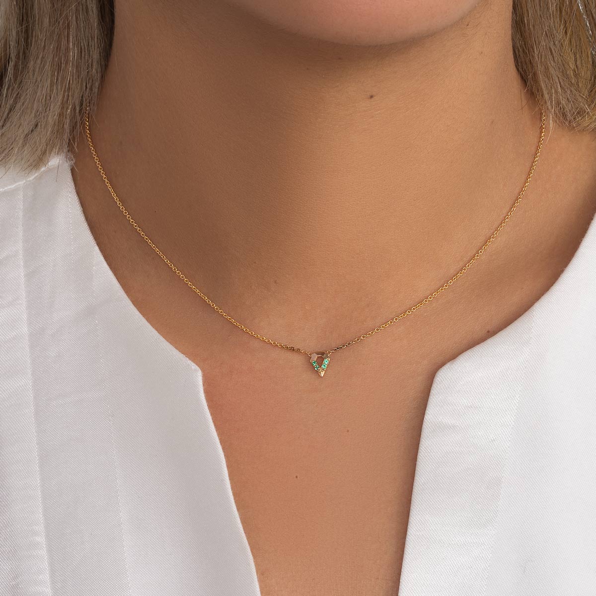 تمتعي بالأناقة والفخامة مع عقدنا المصنوع من الماس الأخضر القوطي. مصنوع من الذهب الصلب عيار 18 قيراطًا ومزين بأحجار كريمة خضراء مقطوعة بشكل دائري، هذا العقد تحفة فنية حقيقية. يضيف شكل الماس إلى تفرده، مما يجعله ضروريًا لأولئك الذين يقدرون الأشياء الأكثر جمالاً في الحياة. ارتقِ بأسلوبك مع هذه القطعة المذهلة.