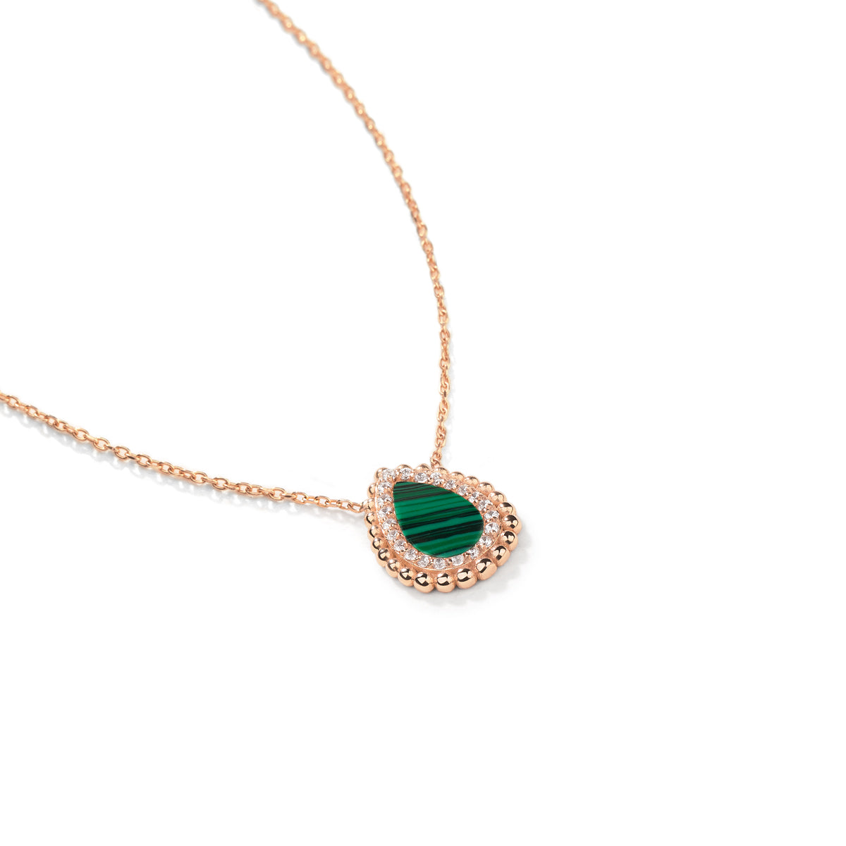 تتميز هذه القلادة الأنيقة بحجر الملكيت الجميل، الذي يكمله رصيف من الماس الطبيعي. مصنوع من الذهب الصلب عيار 18 قيراط، مما يضفي لمسة أنيقة على أي مظهر. باعتباره حجرًا كريمًا ثمينًا، يُعتقد أن الملكيت يتمتع بخصائص علاجية ويجلب التوازن والنجاح لمرتديه.