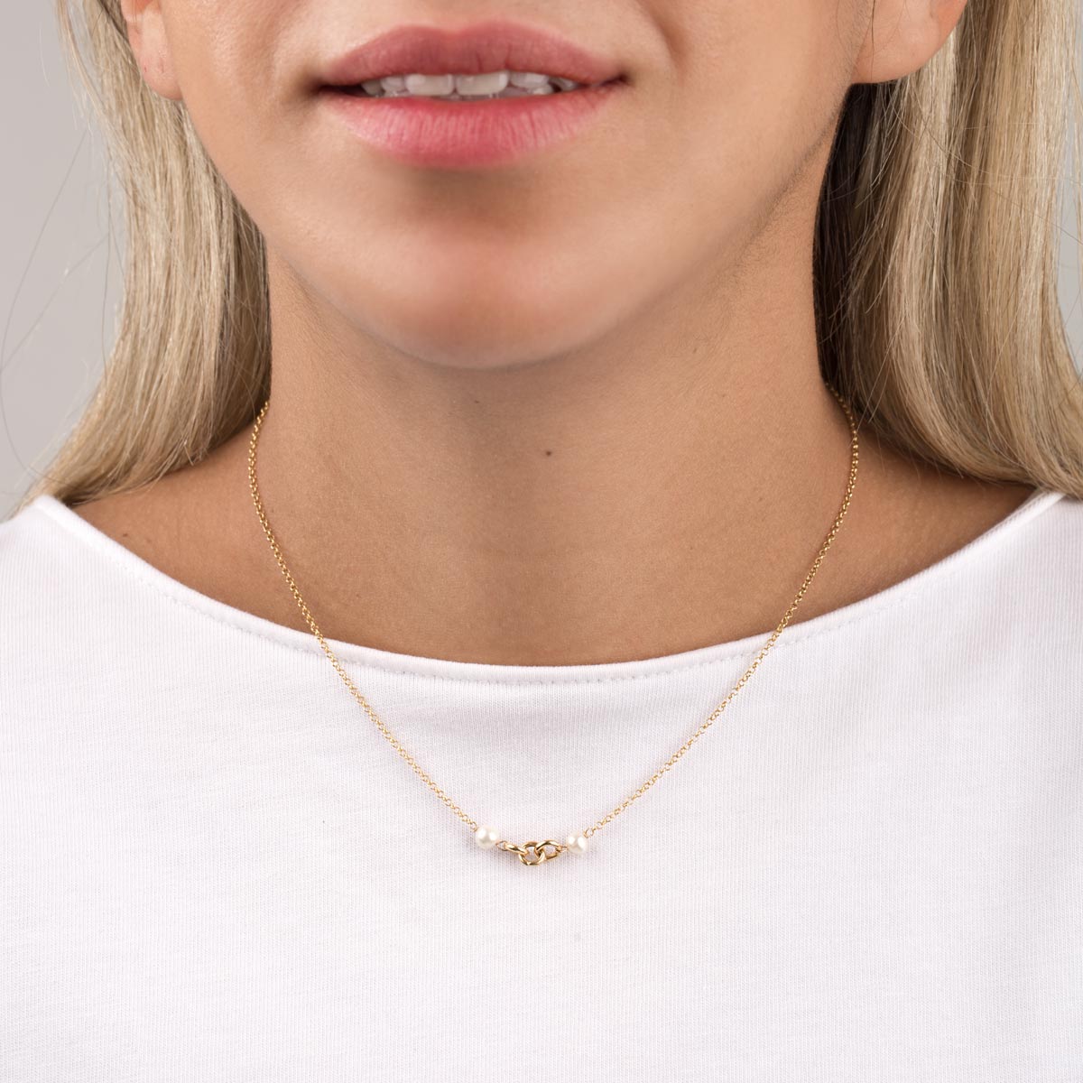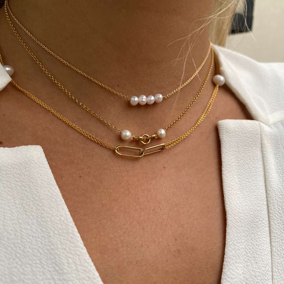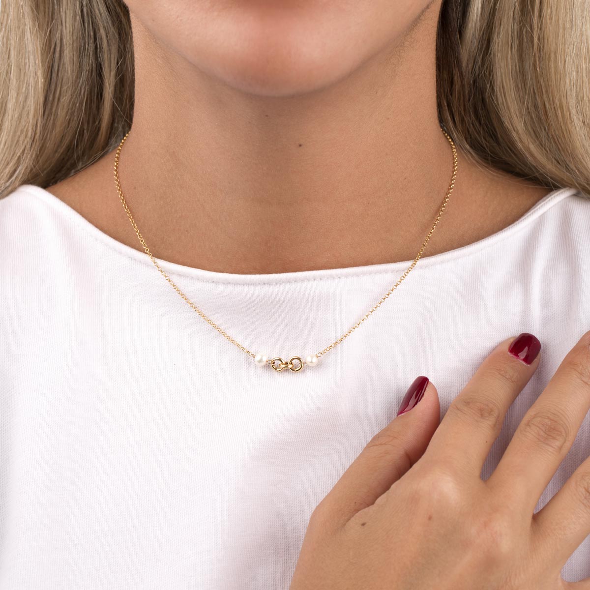أبرزي أناقتك بمشابك اللؤلؤ المصنوعة من الذهب الصلب عيار 18 قيراطًا. تتميز القلادة المتدلية بشكل سلسلة فريد، مزينة بلؤلؤتين طبيعيتين على الجانبين. عززي من أناقتك بهذا الإكسسوار الفاخر والحصري.