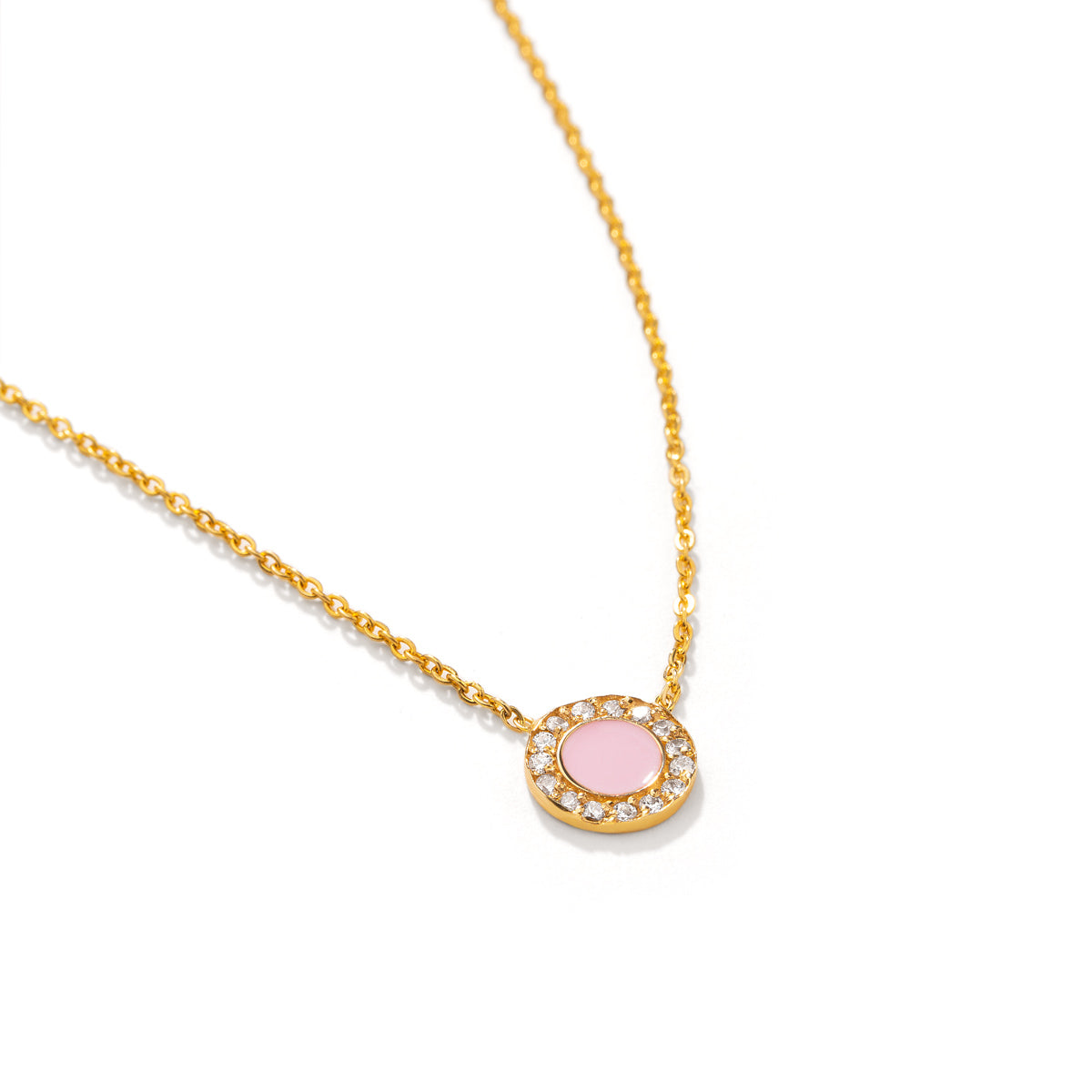 استمتعي بالفخامة مع عقدنا المصنوع من المينا الوردي اللامع. صُنع هذا العقد من الذهب الصلب عيار 18 قيراطًا ومزينًا بالألماس المقطوع بشكل دائري، وهو يضفي لمسة من الأناقة على التصميم، مستوحى من التأثير المبهر للوهج. ارتقي بأي زي بهذه القطعة الحصرية.