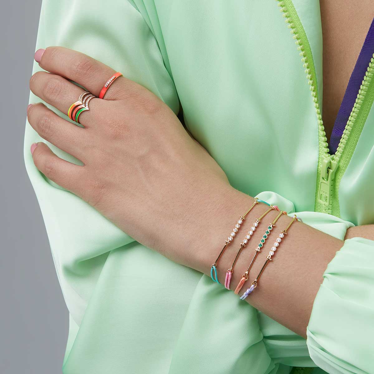 Embrace the glamorous and exclusive elegance of our Pink Sparkle Cord Bracelet. Crafted with 18k gold and adorned with a vibrant green gemstone, this bracelet will add a touch of sophistication to any outfit. Let your style sparkle with this exquisite piece.