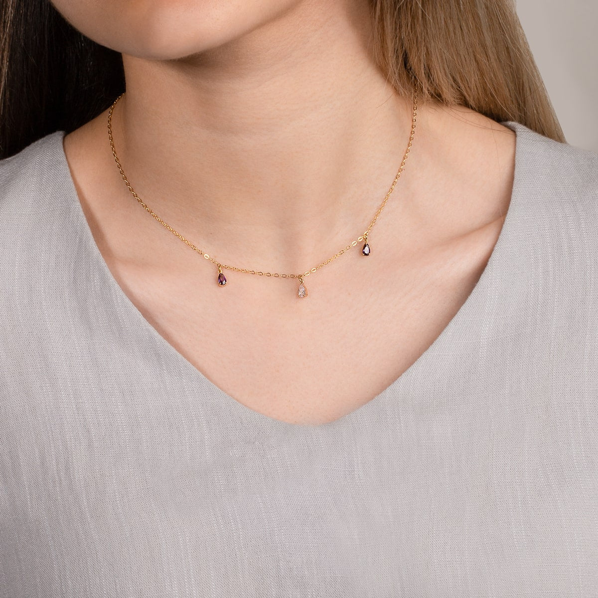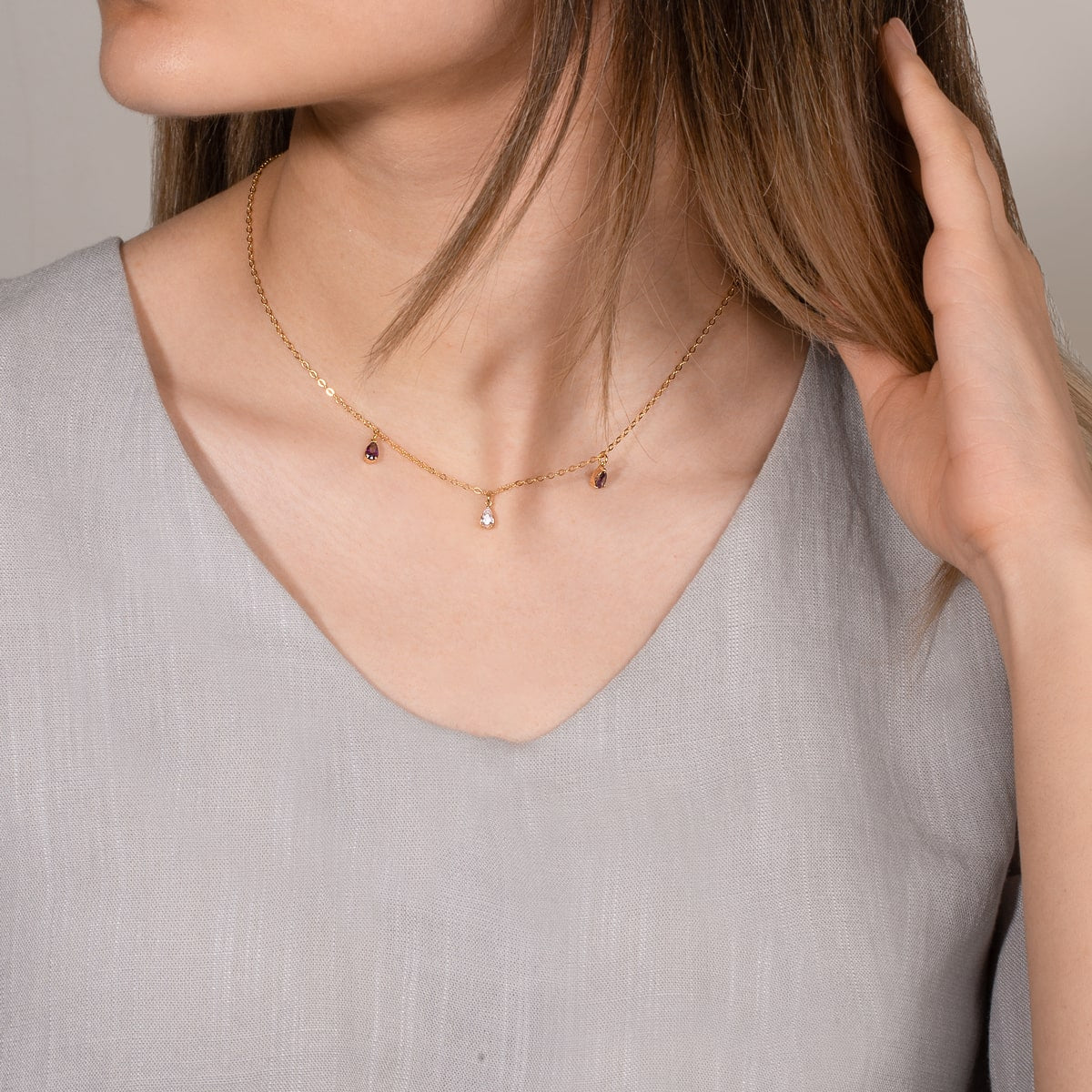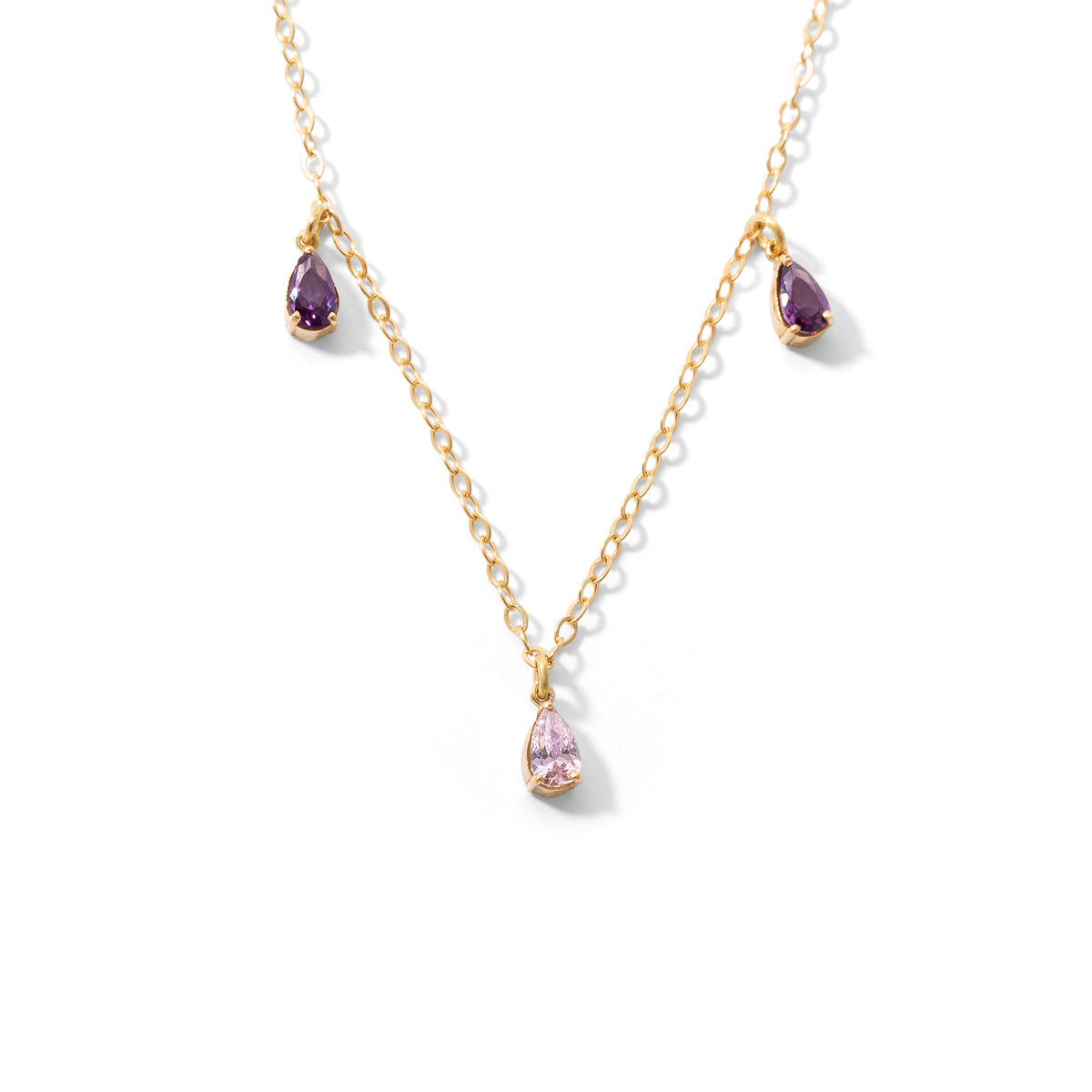 زيني نفسك بالفخامة والأناقة مع قلادة القطرات الأرجوانية. مصنوعة من الذهب الصلب عيار 18 قيراطًا، تتميز هذه القطعة المذهلة بأحجار كريمة أرجوانية مقطوعة على شكل كمثرى في شكل قطرات فريدة من نوعها. الإضافة المثالية لأي زي، هذه القلادة تنضح بالحصرية والرقي. انغمسي في رفاهية المجوهرات الفاخرة مع هذه القلادة الرائعة.
