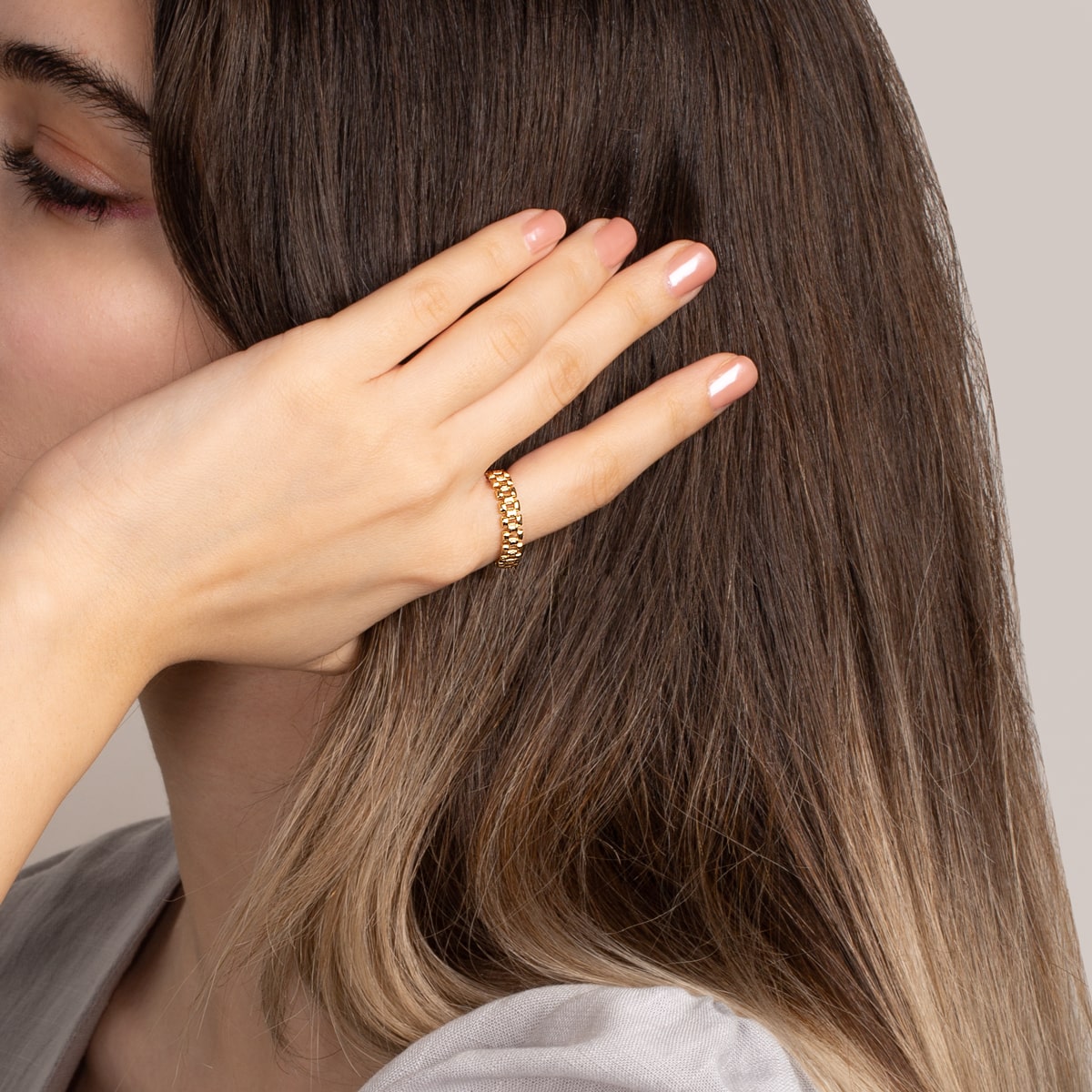 استمتعي بالفخامة الخالدة مع خاتم رولكس النحيف. مصنوع من الذهب عيار 18 قيراطًا، يتميز هذا الخاتم الأنيق بتصميم نحيف يزين إصبعك بشكل رائع. سيضفي مظهره الرقيق والمتطور لمسة راقية على أي زي، مما يجعله ضروريًا لأي شخص مهتم بالموضة.