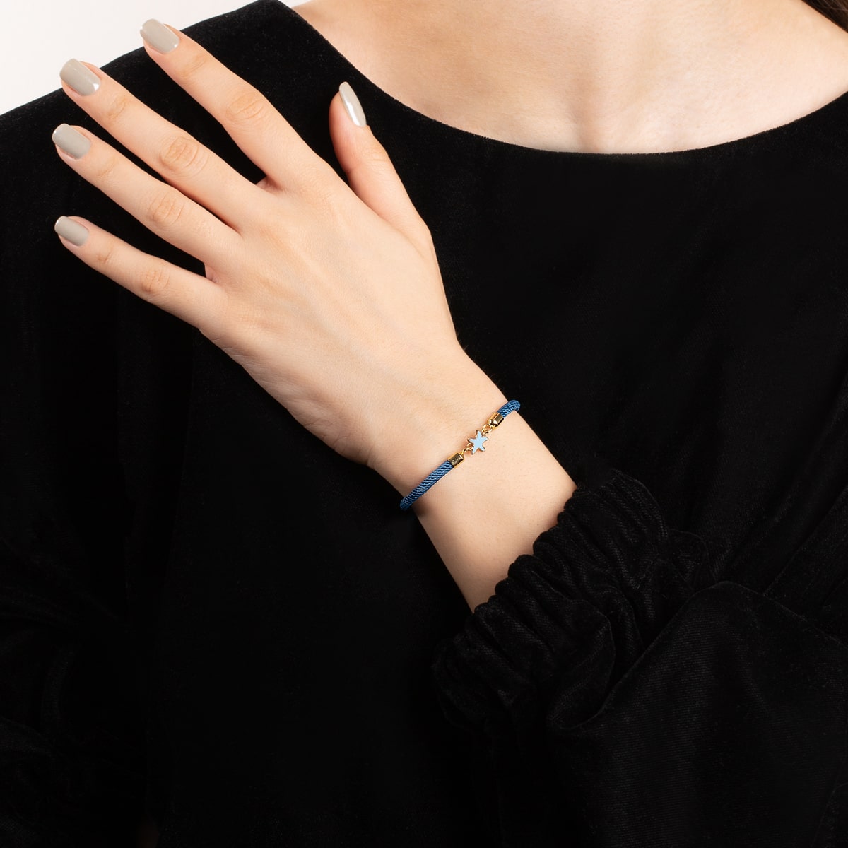 استمتعي بالأناقة الفاخرة التي يوفرها سوارنا المصنوع من مينا النجوم. تم وضع المينا الزرقاء المذهلة بدقة على النجمة الذهبية عيار 18 قيراطًا، مما يخلق مظهرًا خالدًا ومتطورًا. ارتقِ بأسلوبك مع هذه القطعة الحصرية التي تنضح بالرقي والذوق الرفيع.