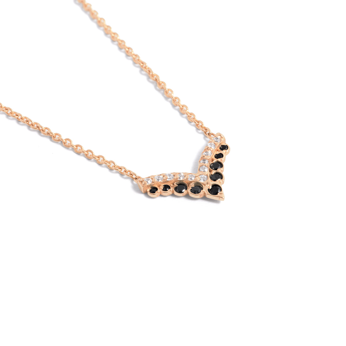 تتميز هذه القلادة الأنيقة المصنوعة من الألماس على شكل حرف V بالذهب الصلب عيار 18 قيراط والألماس الطبيعي عالي الجودة مع تصميم فريد على شكل حرف V. يضيف تضمين الماس الأسود الرقي ويرفع من مظهرك. مثالية لإضافة لمسة من الفخامة إلى أي ملابس.