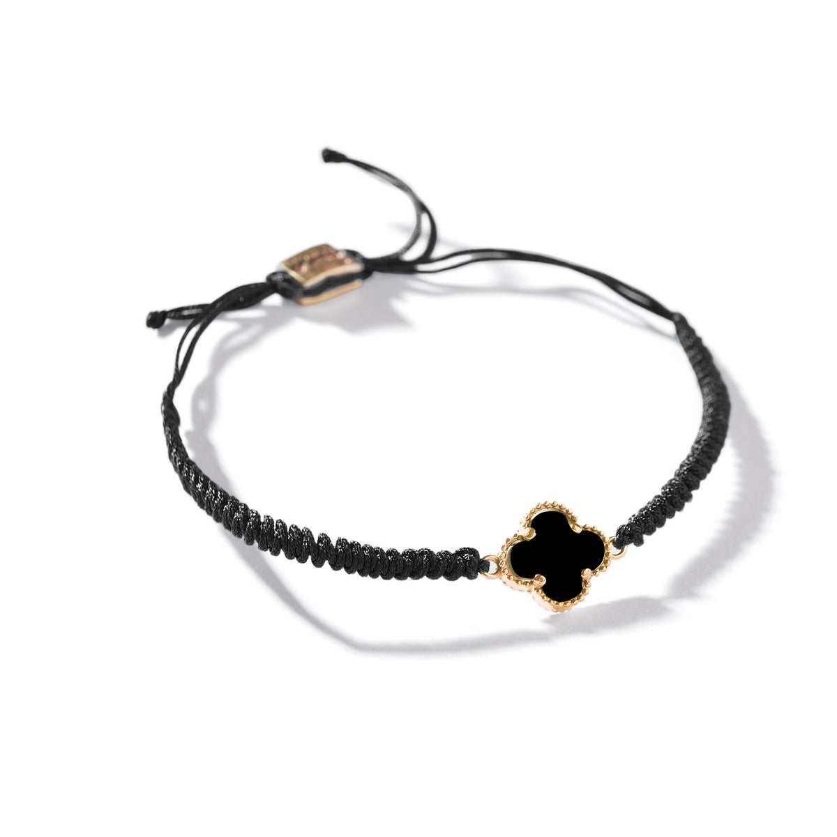 Indulge in a touch of charm and luxury with our Black Clover Cord Bracelet. Crafted in 18k gold, this bracelet features a stunning black clover charm that exudes sophistication and elegance. Elevate your style with this exquisite piece, perfect for any occasion.