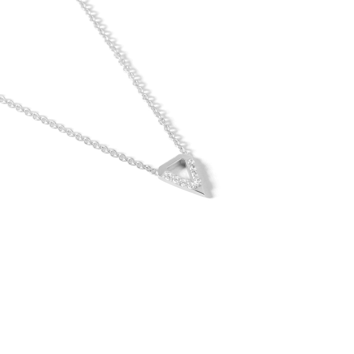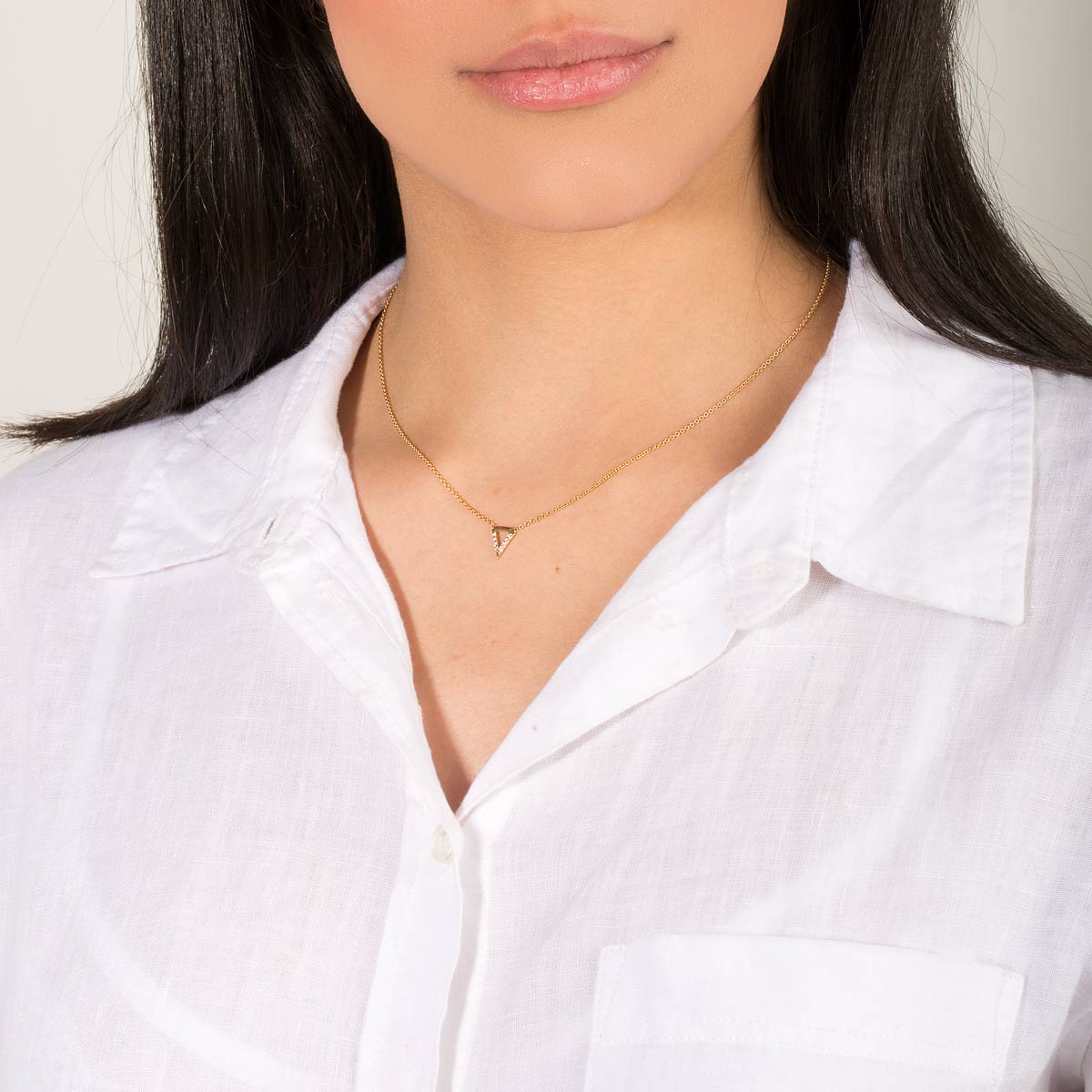 Make a stylish statement with our Bright Bermuda Necklace. Crafted from luxurious 18k solid gold, this linked necklace features a striking inverse triangle pendant adorned with fine natural diamonds on two of its legs. Elevate any outfit with this sophisticated and exclusive piece.