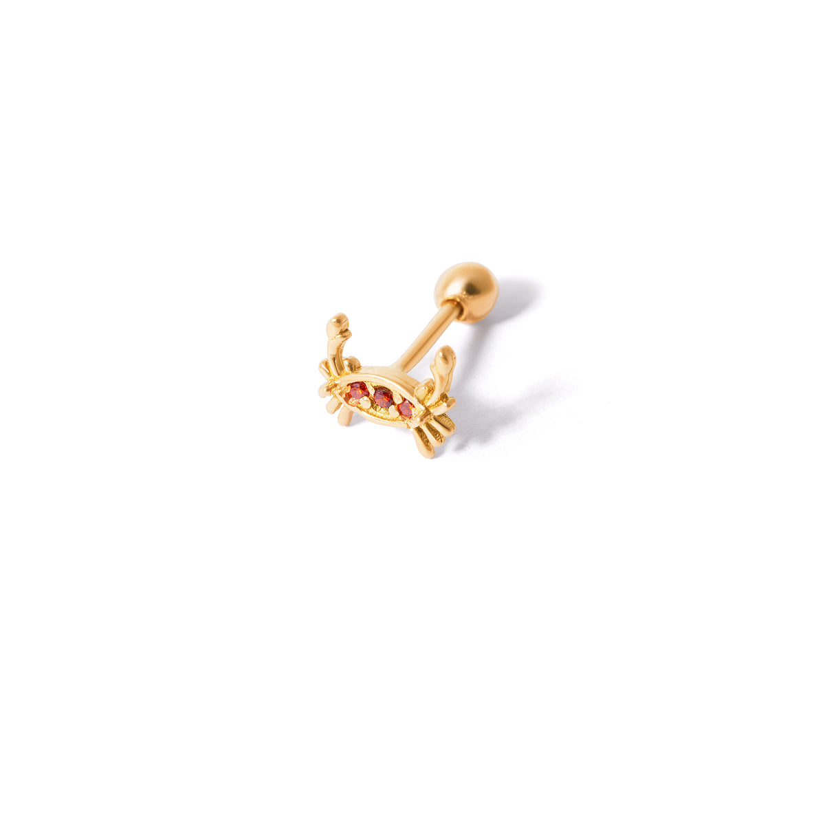 Indulge in luxury with our Crab Piercing, crafted from 18k solid gold. Inspired by the captivating form of a crab, this stunning piece is adorned with bright red gemstones for a touch of richness. Complete your sophisticated look with this exclusive accessory.