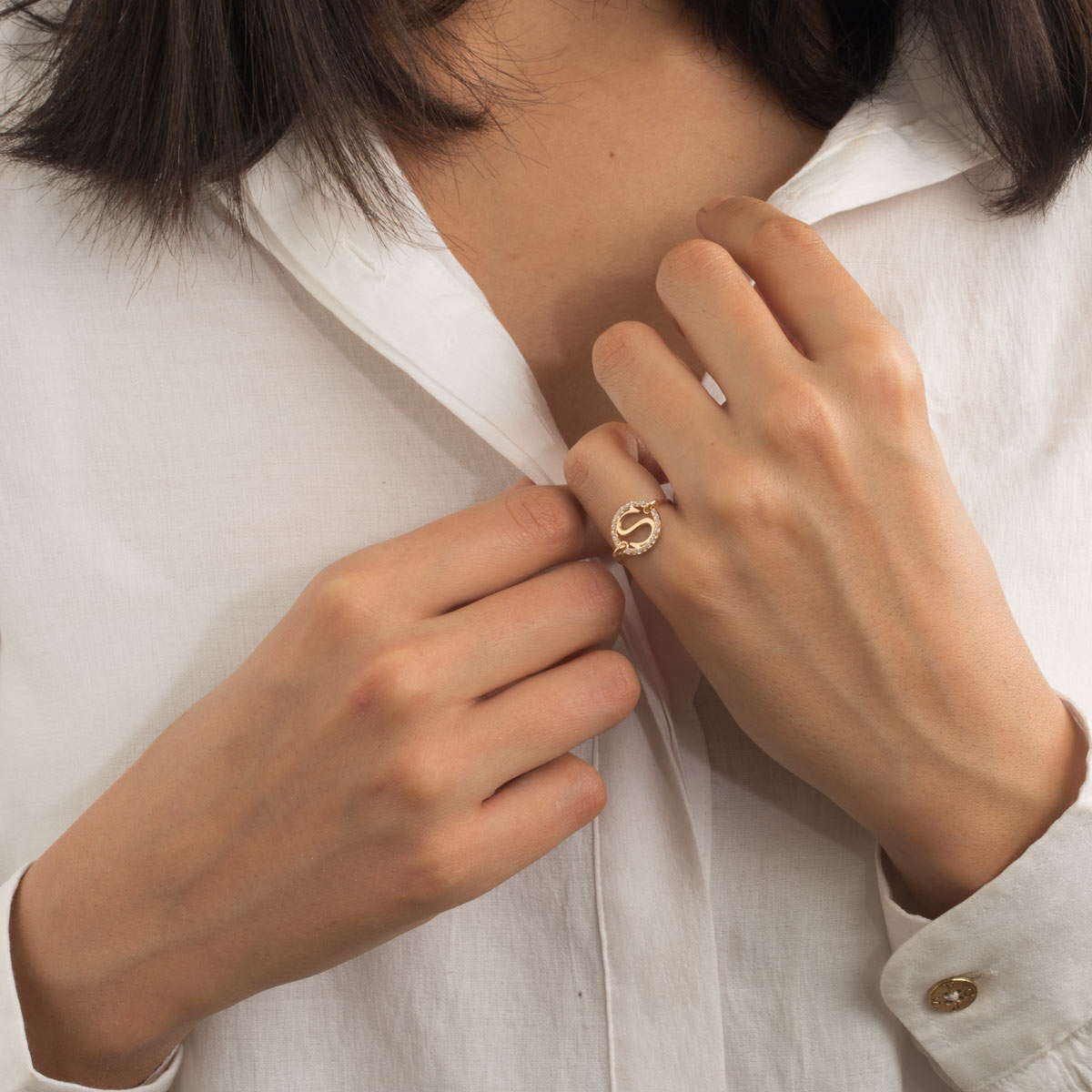 Introducing our diamond-adorned 18k gold Letter "S" Ring. A perfect blend of elegance and luxury, this ring is the epitome of sophistication. Make a statement with this exclusive piece that exudes a literary charm.