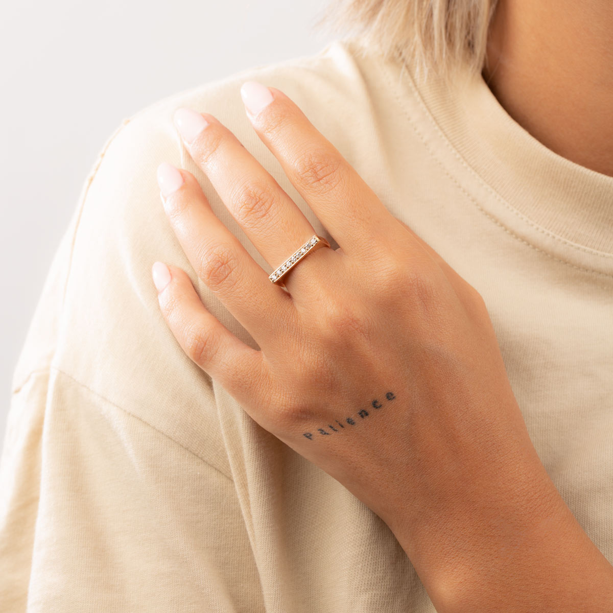 Elevate your style with our Line Diamond Ring. Crafted with 18k gold, this ring is the epitome of luxury and sophistication. The sleek and simple design is accentuated by a line of dazzling diamonds, making it a perfect addition to any outfit. Sparkle and shine with this exclusive piece.
