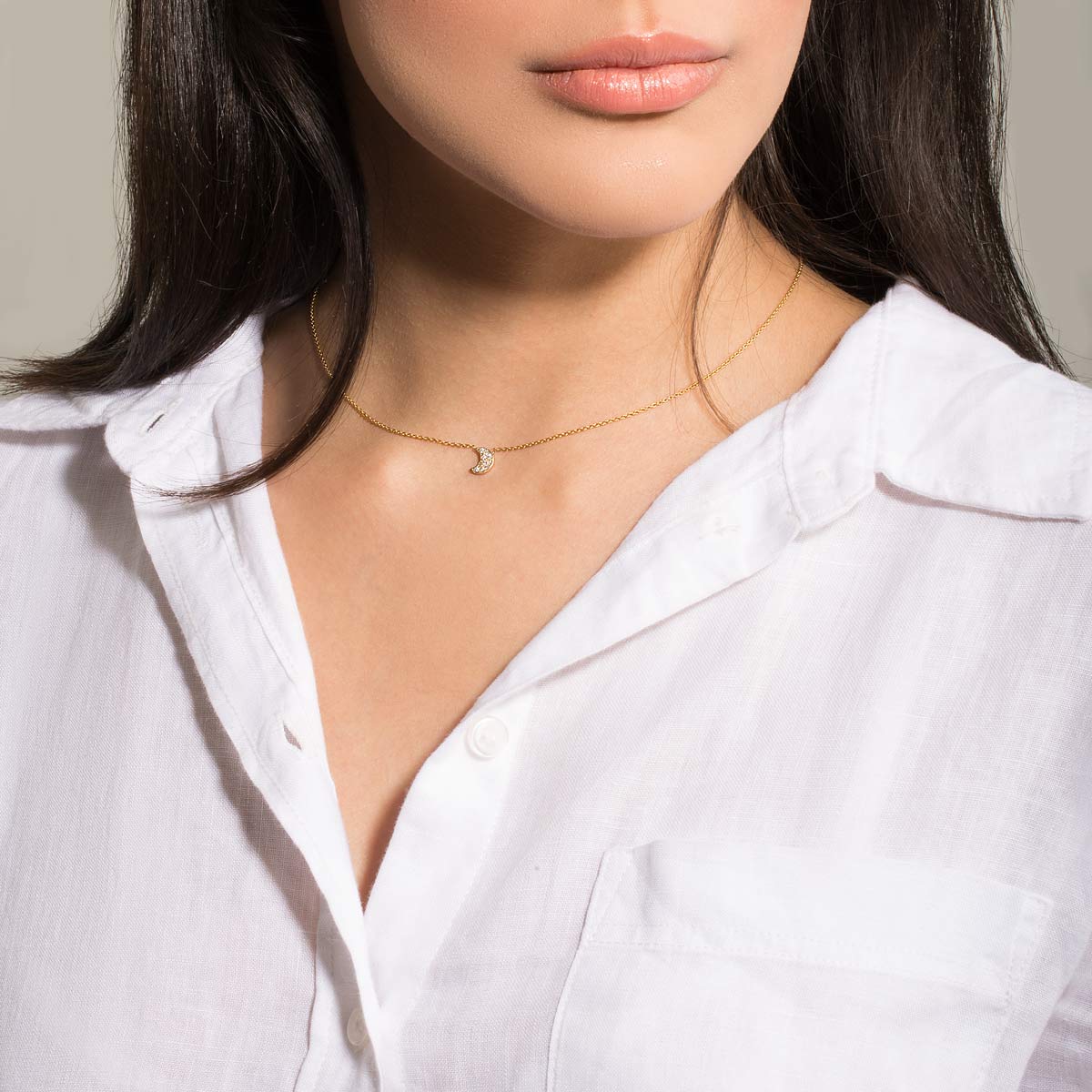 Indulge in the celestial beauty of our Pavé Diamond Moon Necklace. Crafted in 18k solid Gold, the moon-shaped pendant features fine natural diamonds that will shimmer with every movement. This exquisite pendant necklace adds a touch of elegant luxury to any outfit.