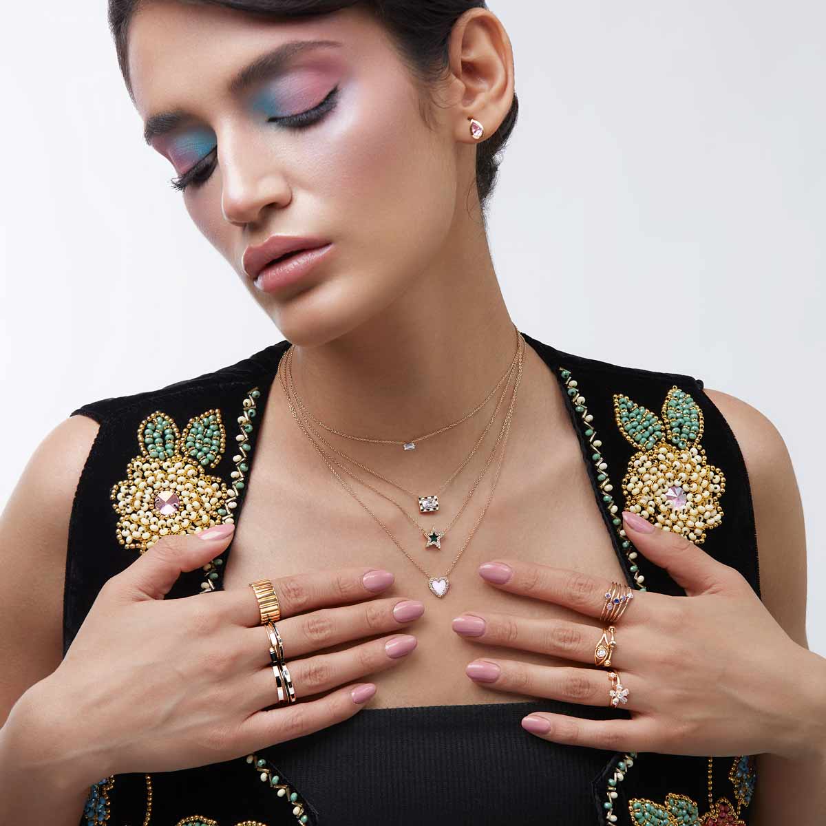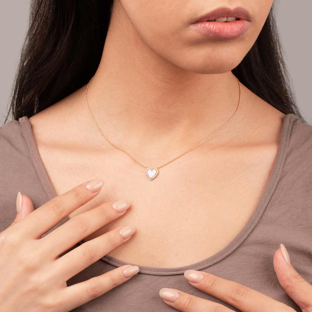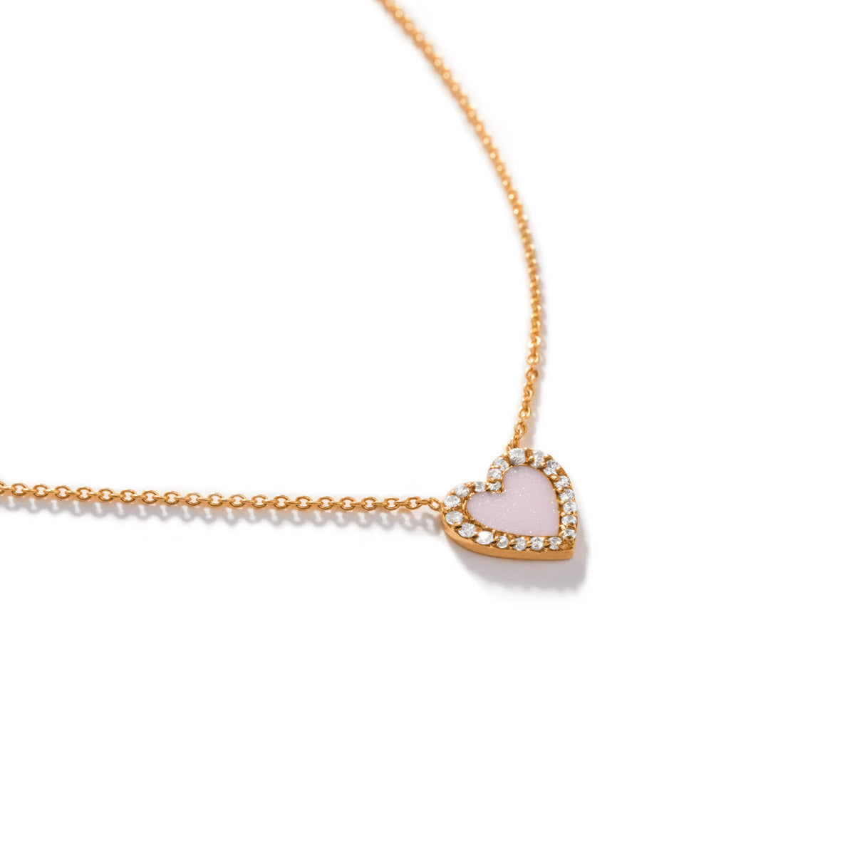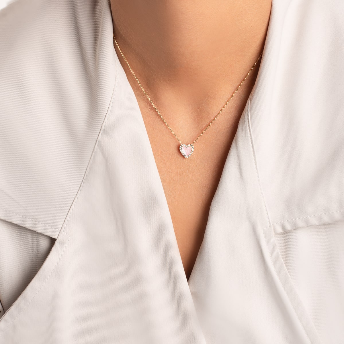 This exquisite Pink Heart Enamel Necklace is crafted with 18k solid gold and adorned with round cut diamonds, creating a delicate heart shape. A luxurious addition to any outfit, this necklace is a symbol of love and elegance. Make a statement with this exclusive and timeless piece.